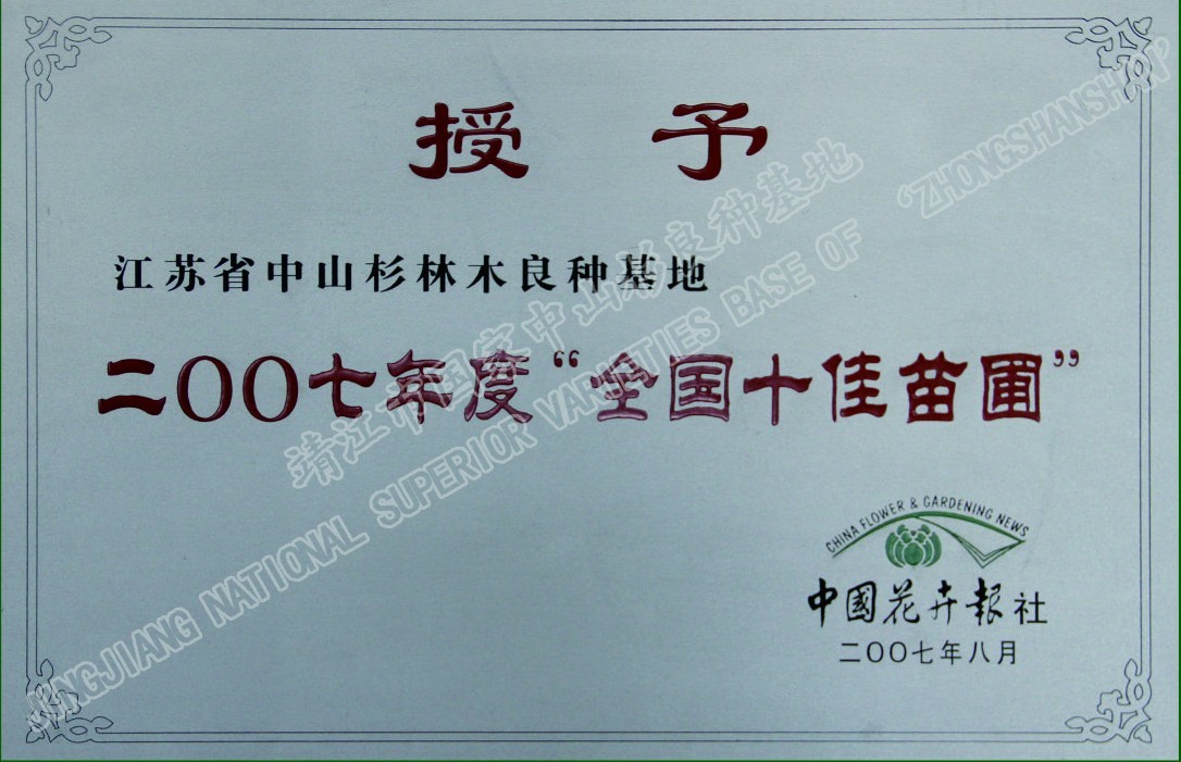 靖江市中山杉林木良種有限公司單位現(xiàn)有職工120人,其中中高級(jí)技術(shù)人員26人,初級(jí)技術(shù)人員45人,高級(jí)技工45多人,備有多功能灑水車、高空作業(yè)車、挖掘機(jī)、草坪噴播機(jī)等齊全的園林施工機(jī)械,年承接綠化工程100萬平方米以上。公司自成立以來,參與了眾多省內(nèi)外綠化重點(diǎn)工程的建設(shè),先后完成江陰長(zhǎng)江公路大橋、潤(rùn)揚(yáng)大橋、南京三橋、蘇州吳中大道、揚(yáng)州西北線繞城、無錫沿江高速、無錫342省道、滬寧高速、泰高路、寧通高......